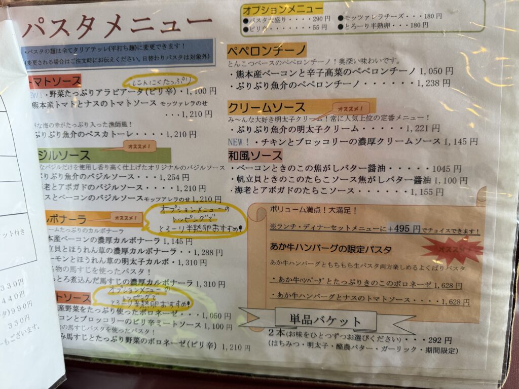 パスタは(トマトソース・バジルソース・カルボナーラ・ミートソース・ペペロンチーノ・クリームソース・和風ソース)より選べます。