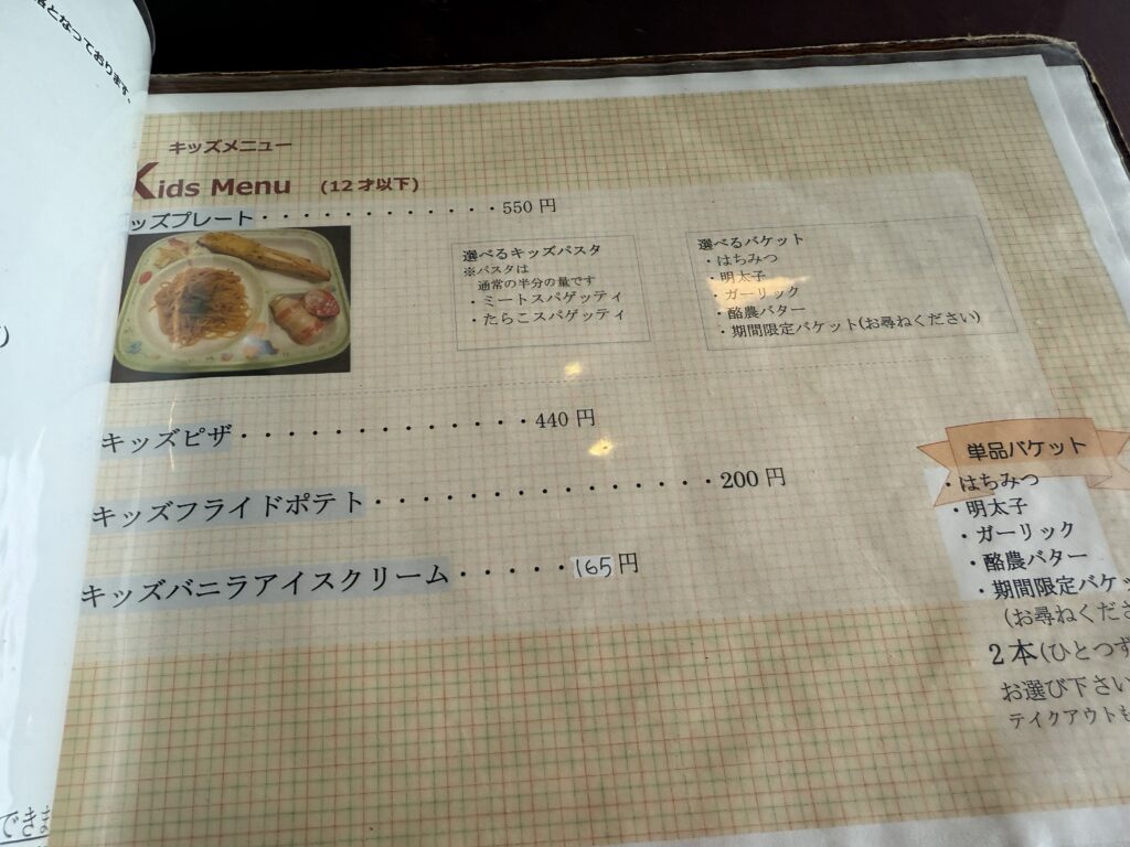 選べるバケットは大人メニュー同様(はちみつ・明太子・酪農バター・ガーリック・期間限定)より選べます。