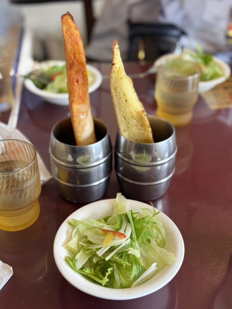(左)明太子バケット(右)ガーリックバケット(真ん中)サラダ