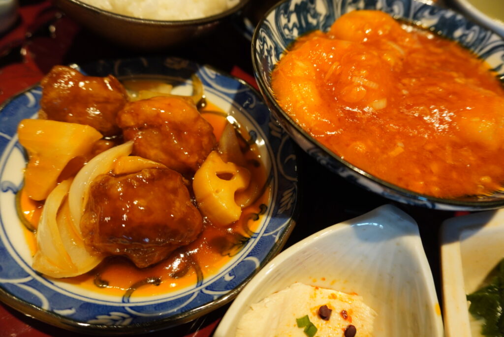 少し甘めの味付けのエビチリはプリップリの海老が3尾も!甘酸っぱい酢豚は野菜シャキシャキで外はサクッと中はジューシーな豚はゴロゴロ大きい3個と食べ応え抜群!!
