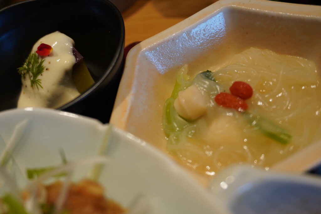そして小鉢は蒸し鶏や春雨やさつまいもが丁寧に盛り付けてあります。