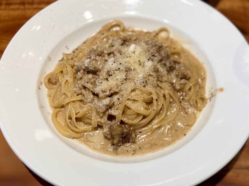 サルシッチャの塩味とポルチーニの香りがクリームソースによく合う濃厚なパスタです。