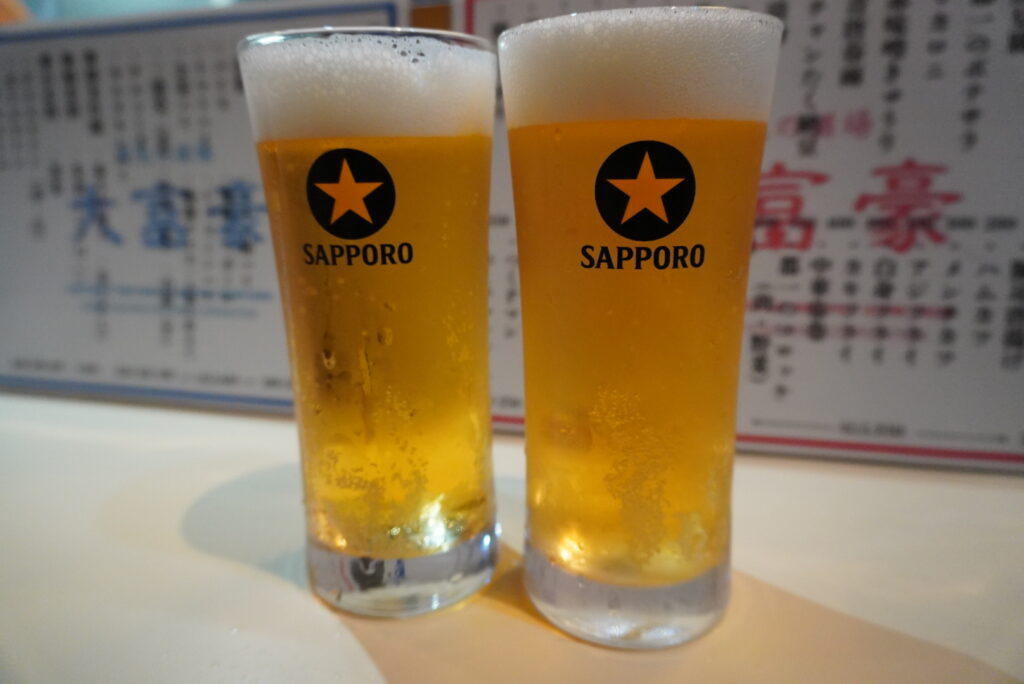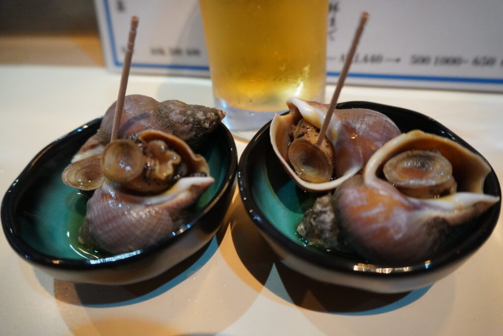 ビールはサッポロビール!そしてお通しはつぶ貝。