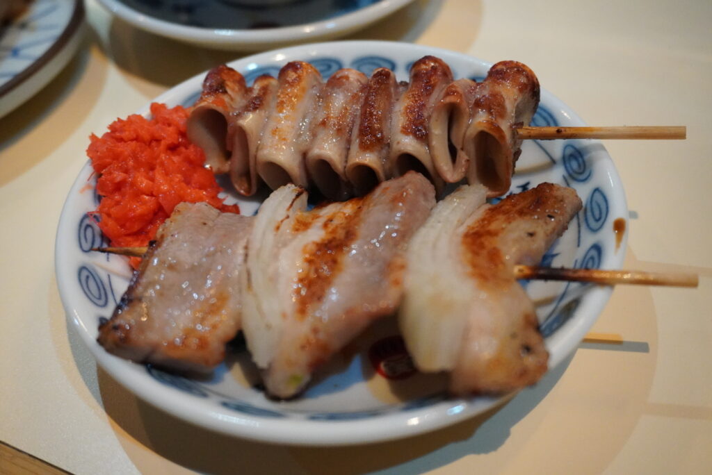 串は一本一本どれも大ぶりで食べ応えがあります。上はハツモトで下があそび豚のバラ串。
