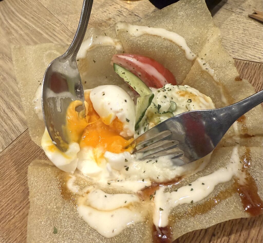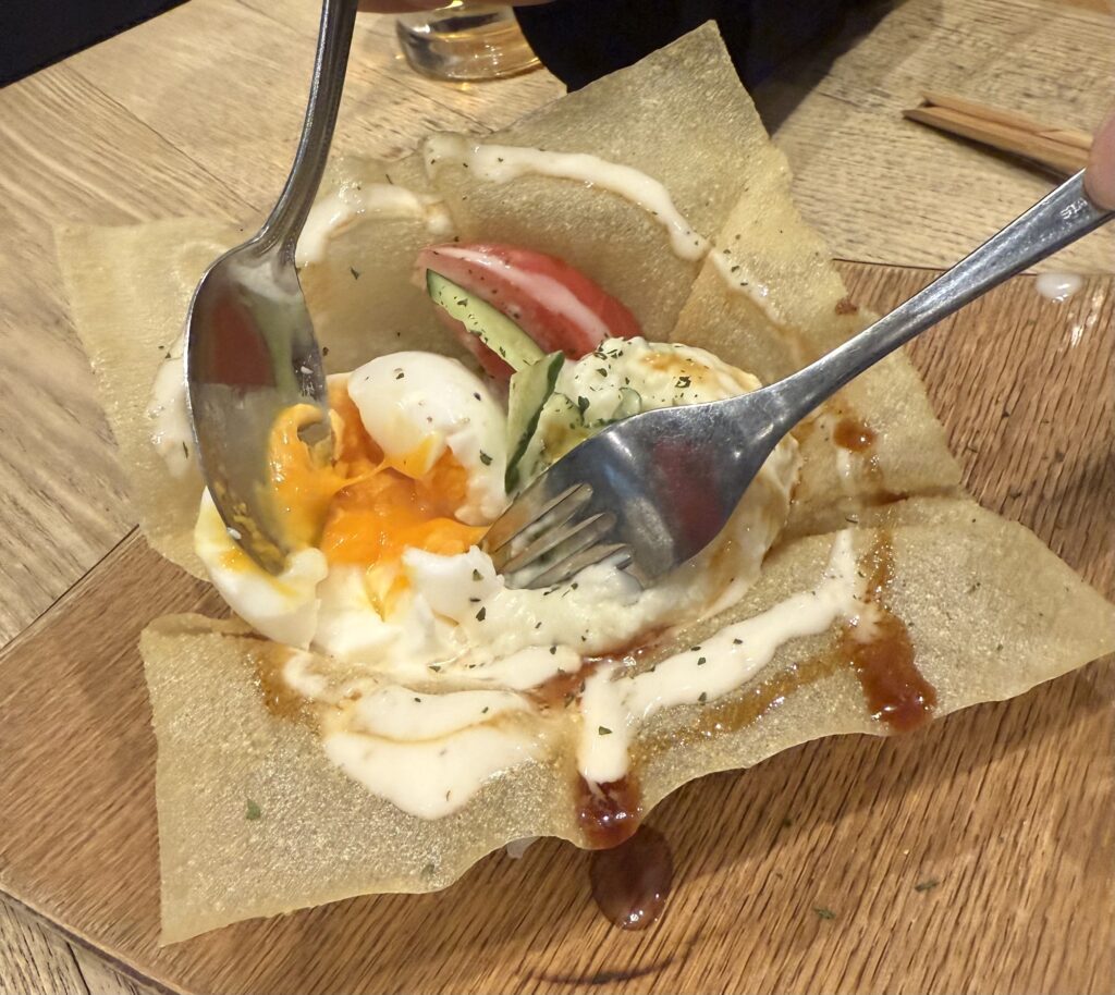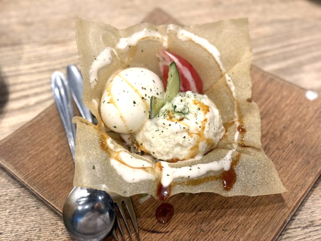 パリパリの皮に半熟の卵、ポテトサラダを混ぜ混ぜ〜してしっかり混ぜたらポテトサラダ完成!食感まで楽しめます♪
