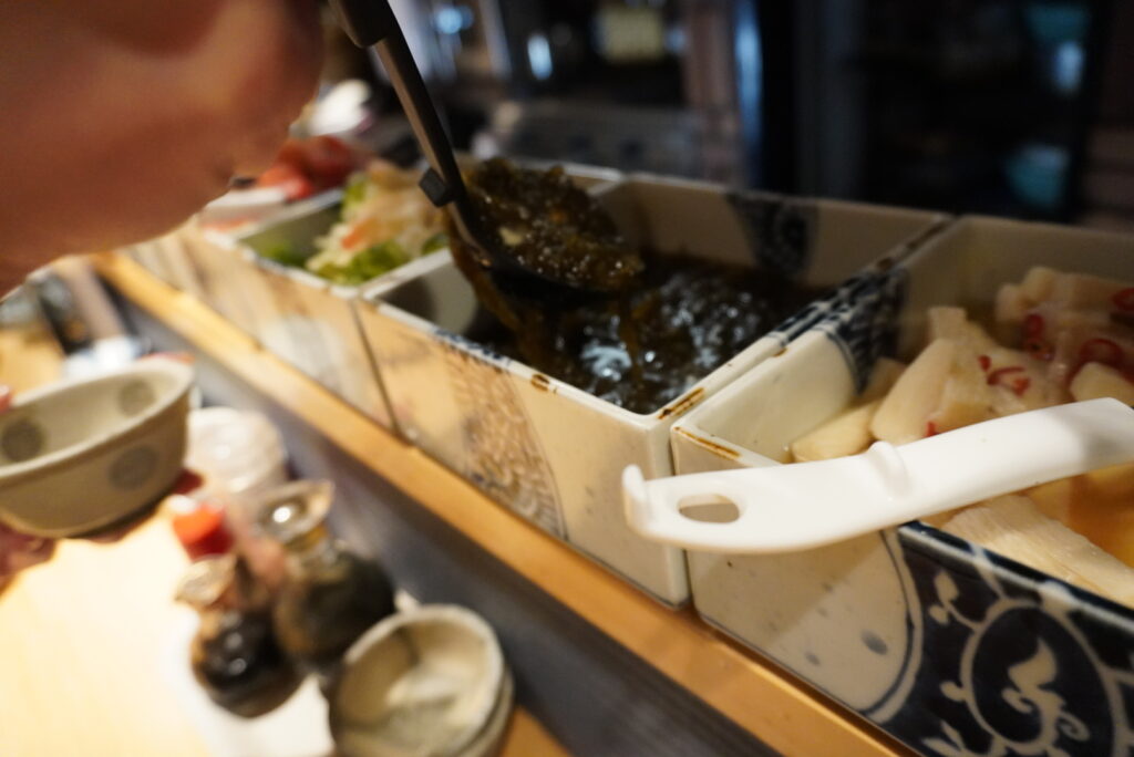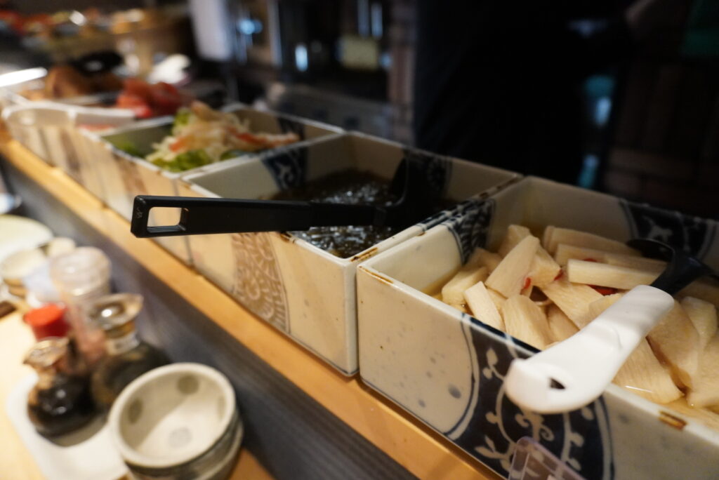 目の前に小皿・中皿が用意してあるので、食べたいものを好きなだけお皿に盛っていきます。