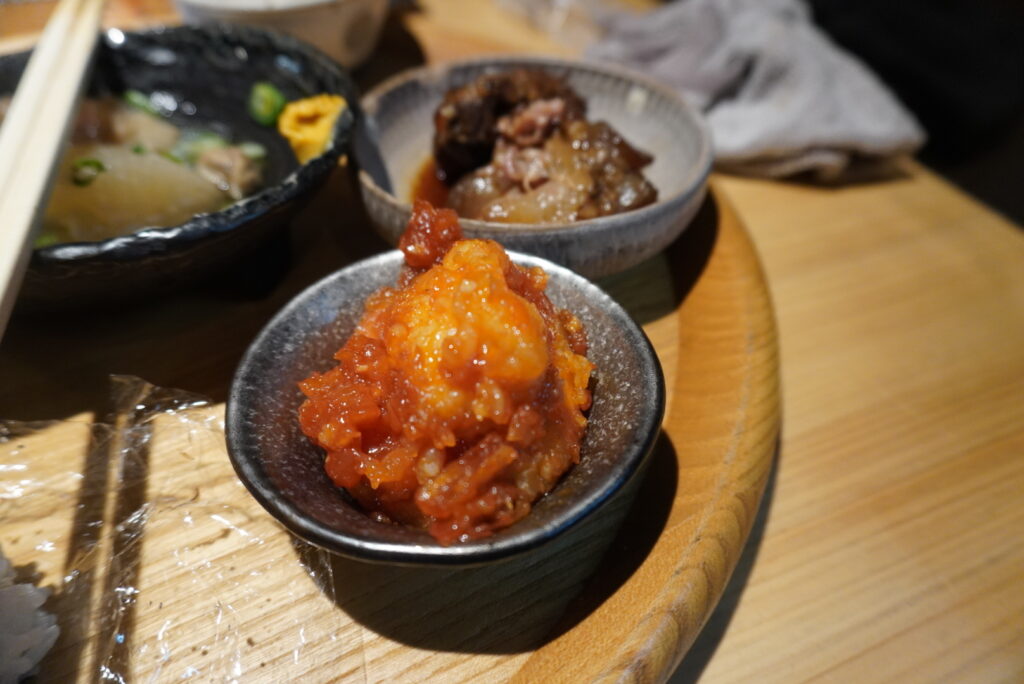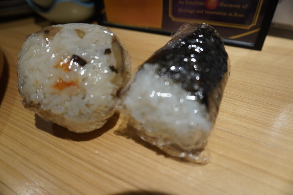 罪悪感を与えない一口サイズのおにぎりは店主のお母様の手作りだそうで梅と混ぜおにぎりの2種があります。