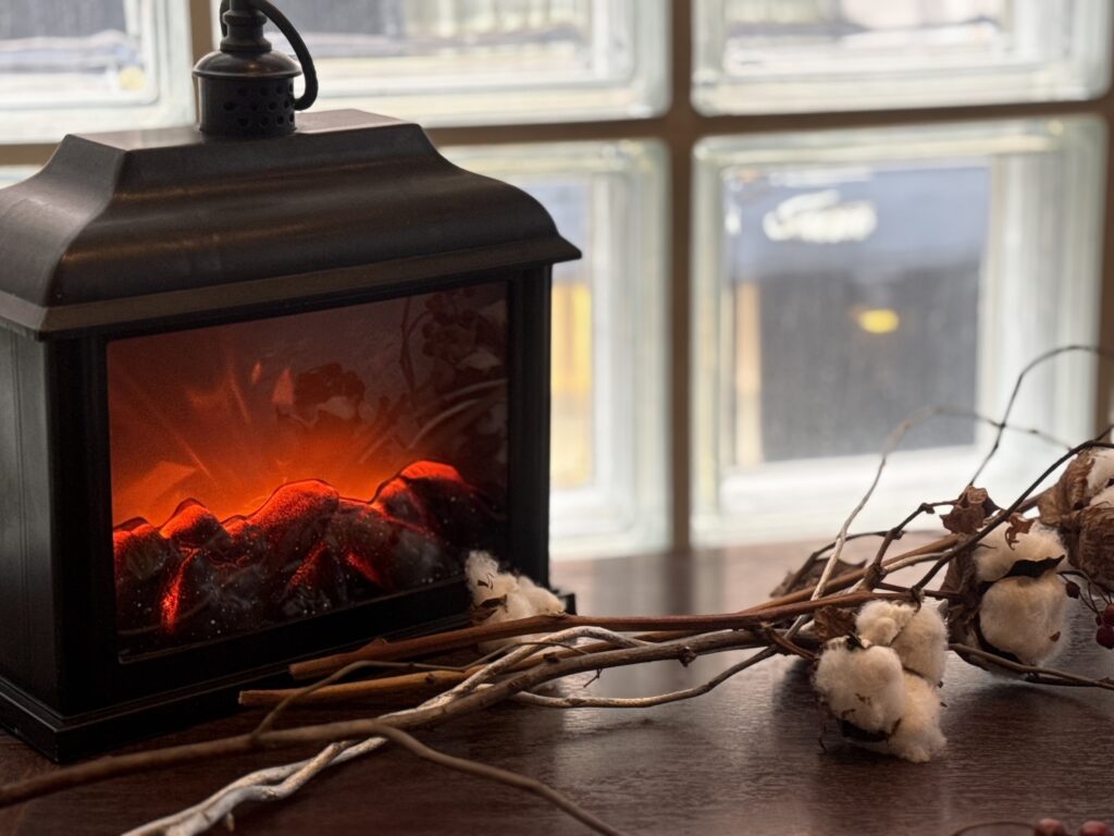 寒い冬にぴったりのストーブで温かい気分。。(実際は横から温かいストーブ(本物)入れてくれます)