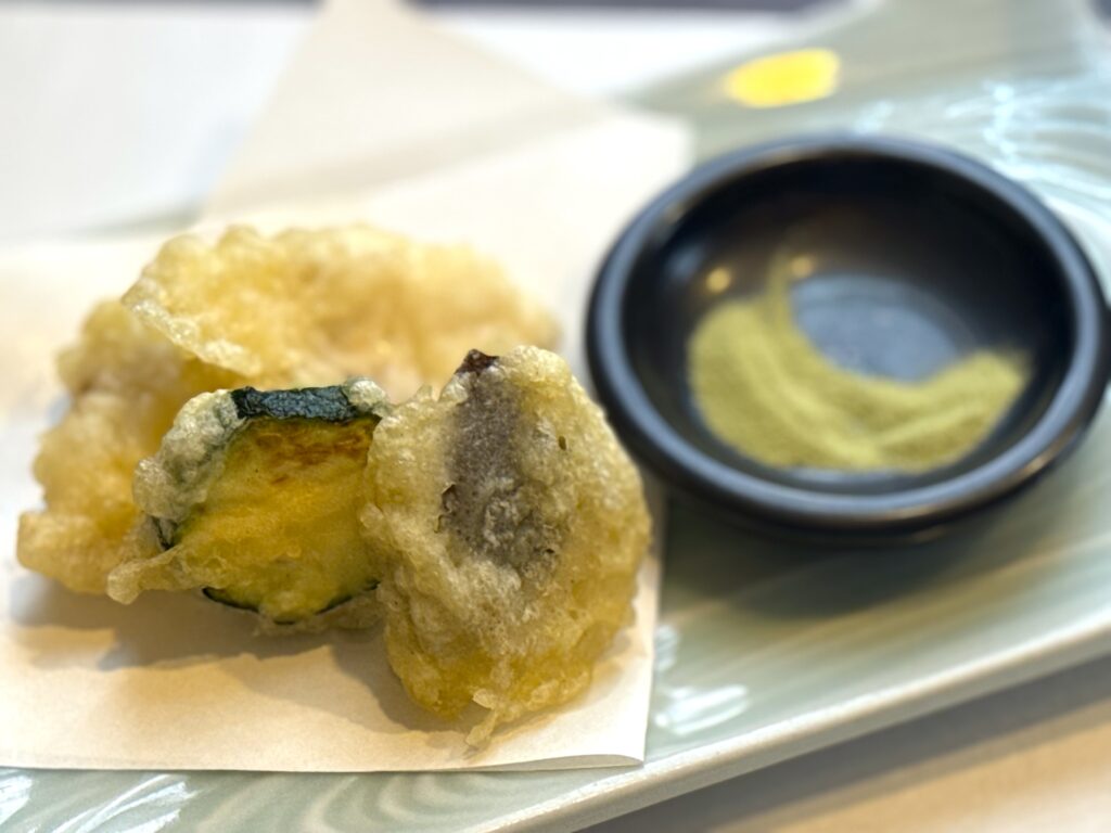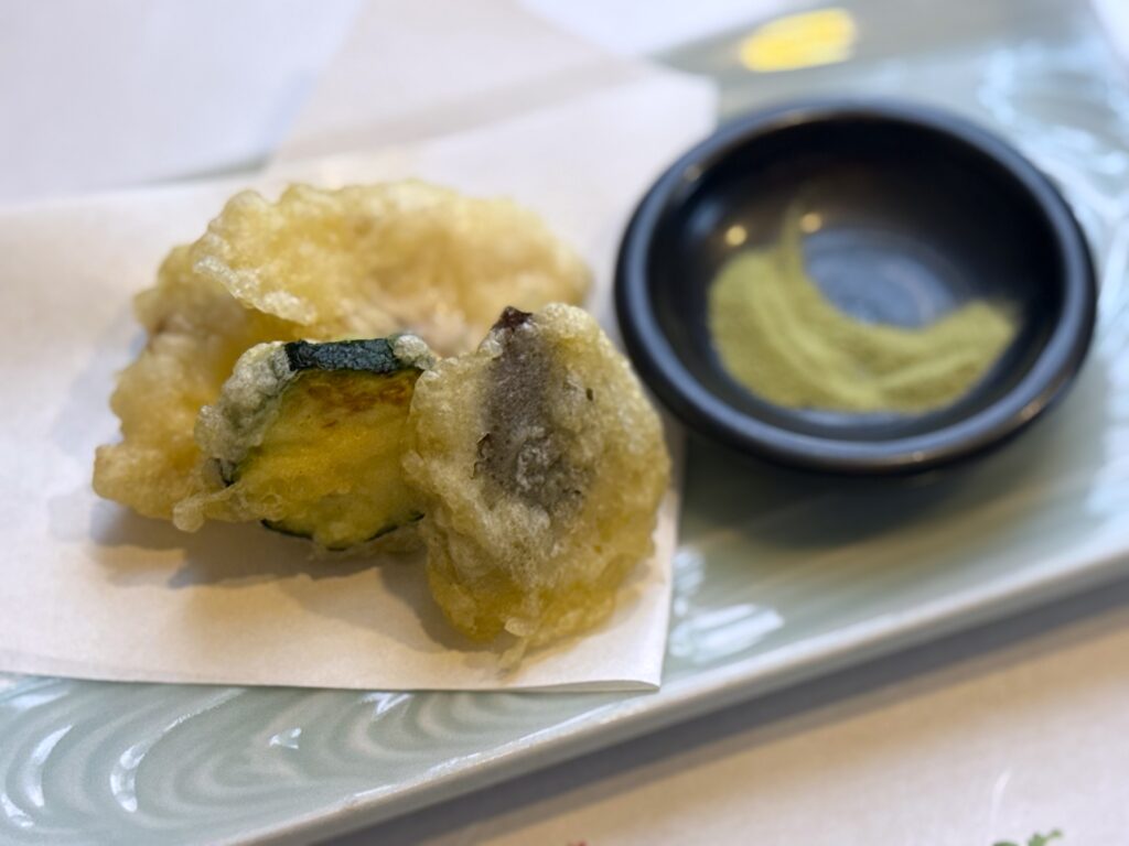そして、天ぷら。天ぷらはアコウダイとエリンギとズッキーニ。