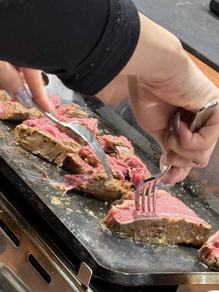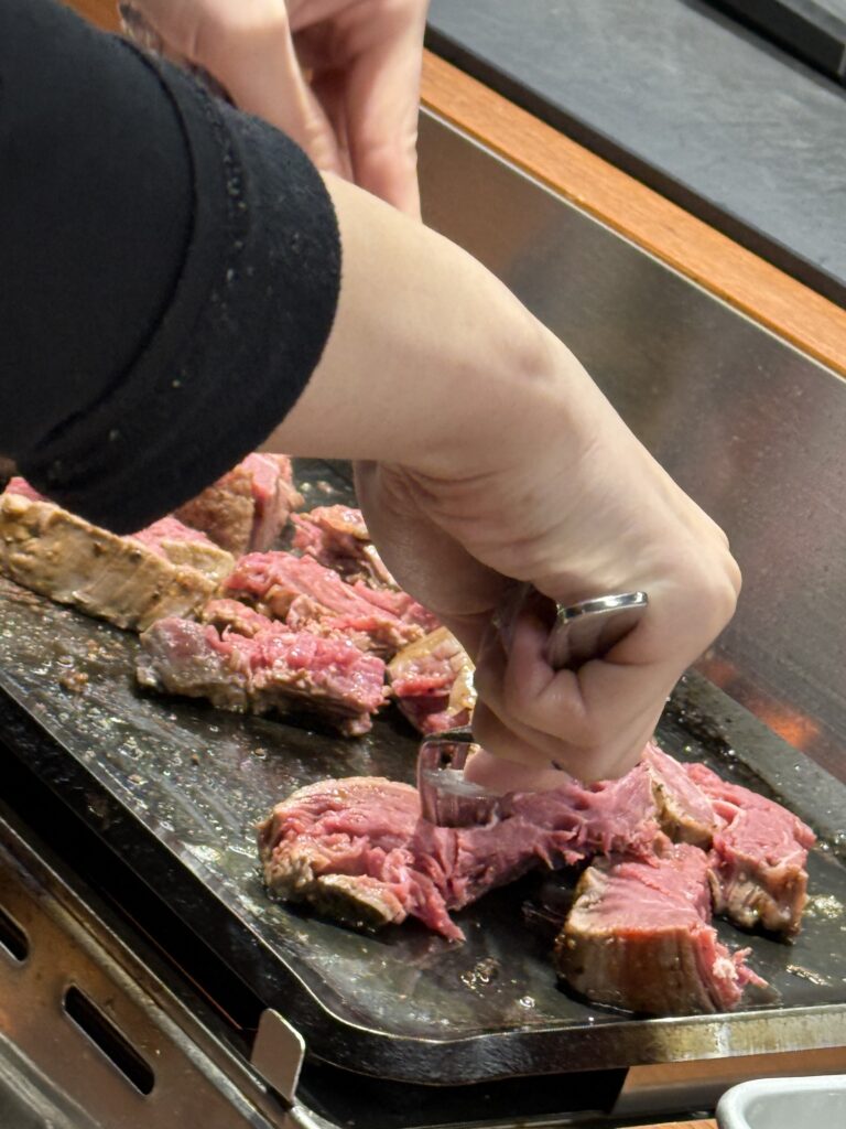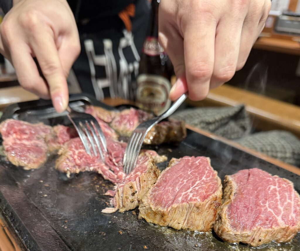 豪快にカットしたらフォークでヒレ肉を引き裂く様に、食べやすいサイズにカットしてくれます。